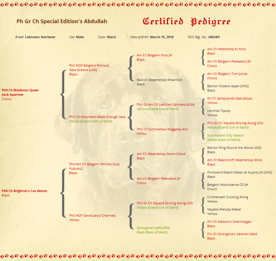 | Breed: Labrador Retriever Sex: Male Color: Black Date of Birth: March 15, 2010 PCCI Reg. No.: 60634l1 | |||